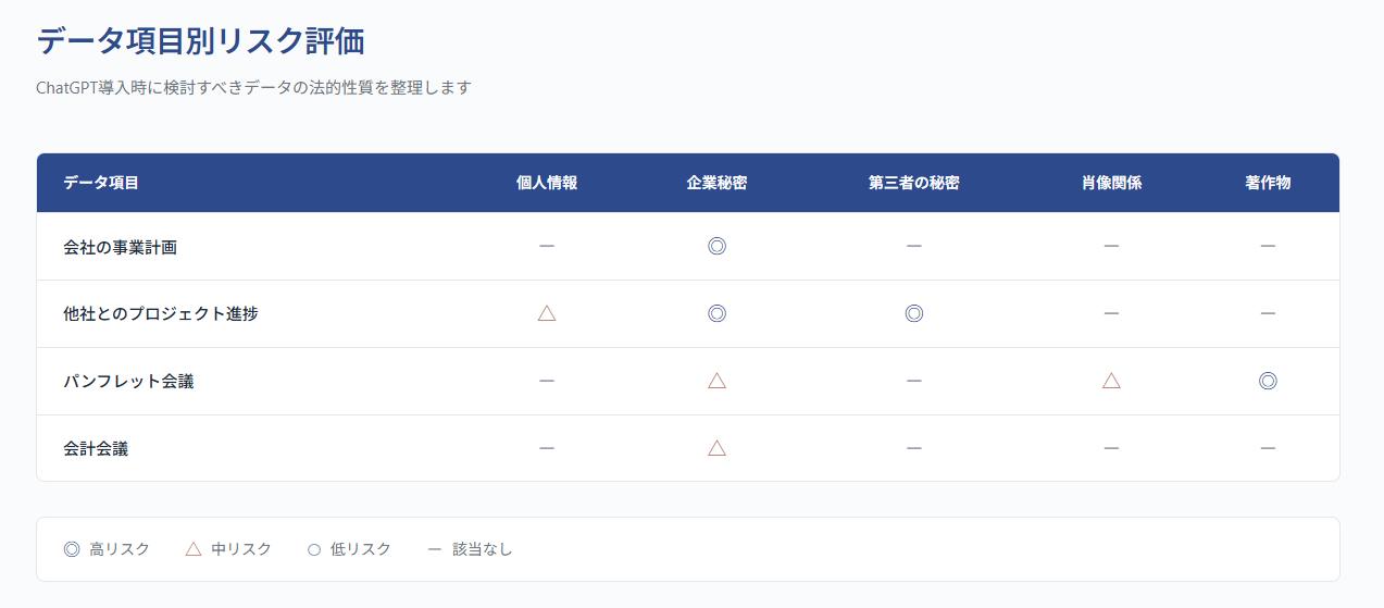 たとえば「データ項目(議事録/パンフ/顧客リスト…)」を縦に並べ、横に「カテゴリ(秘密/著作権/個人情報…)」を置くだけで、「何がリスクの中心か」「どれから対策すべきか」が見えるようになります。