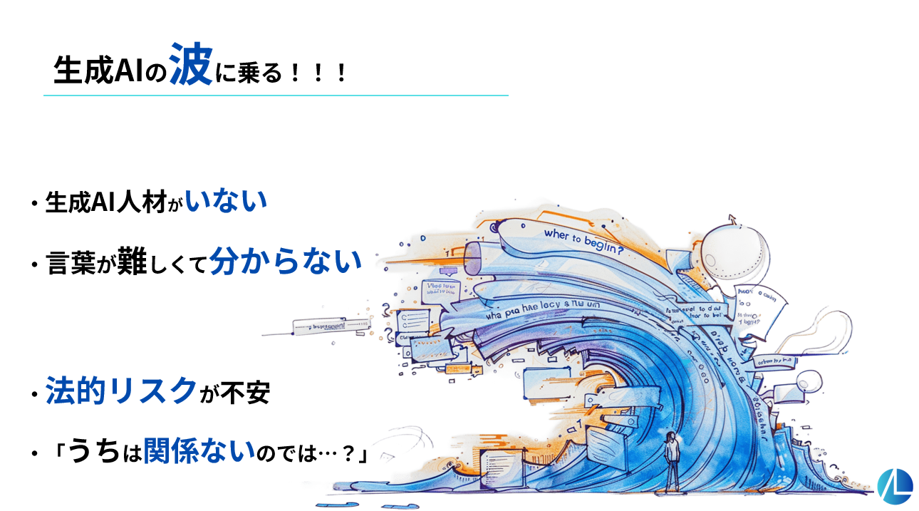 その背景には、「生成AIを使ってどれくらい利益につながるのかイメージしにくい」というのが本音があるように思います。加えて、専用モデルを使うべきか、著作権や個人情報の問題はどうなのか、入力した情報が学習に使われるのではないか——こうした不安や疑問が錯綜していて、様子見になっている企業が少なくありません。