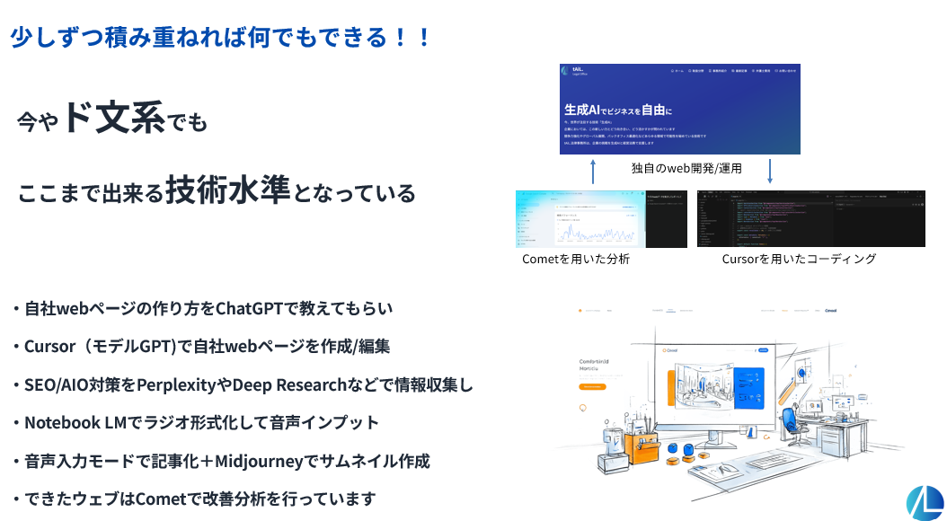 改善点が見つかったら、それをまたCursorで反映させる。改善効果が出ているかどうかは、再びブラウザエージェントでGoogleアナリティクスやSearch Consoleを分析して確認する。このサイクルをぐるぐる回しながら、Webサイトの設計・運用・改善を進めているイメージです。ほとんどの工程で生成AIが関わっていて、それぞれの役割を分担させながら運用しています。
