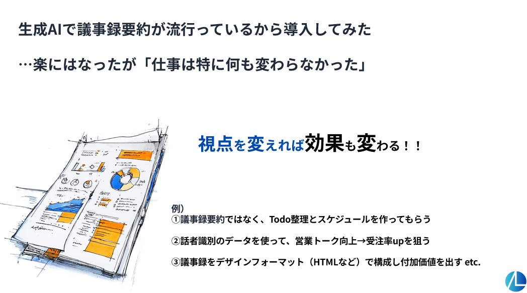 そこで本記事では、当事務所が様々な生成AI活用をする中で、最も汎用的で、データの権利義務のリスクが相対的に低く、売上やブランディングなどROI的に結果を出しやすい使用例を紹介したいと思います。