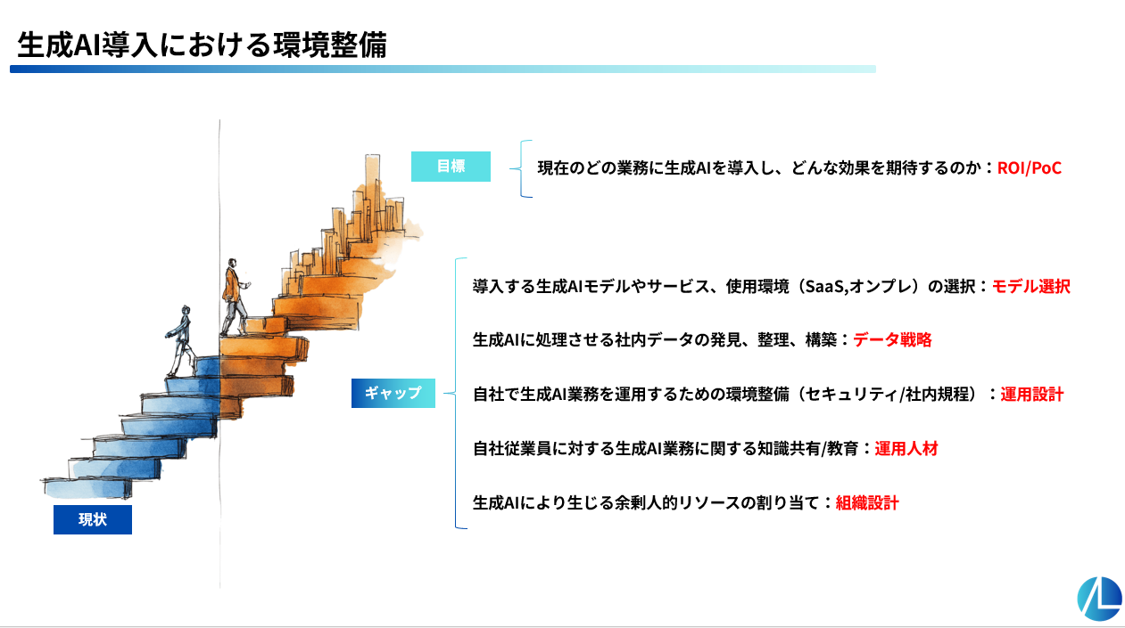 では、生成AIを導入しようとする企業において、経営者の目線からどのような導入計画を持つべきなのかを考えてみたいと思います。