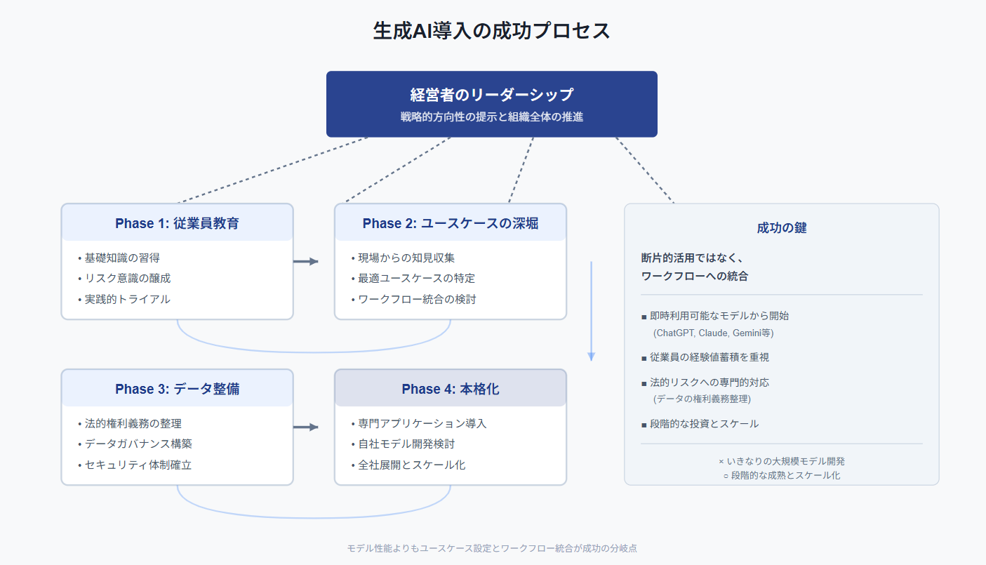 経営者の役割は、具体的なモデルの選定や設計を行うことではなく、レポートが示す通り、個々の従業員からは発案しにくい「生成AIを自社事業のワークフローへ統合させる」ことを試みるという意思決定を行うことだといえます。