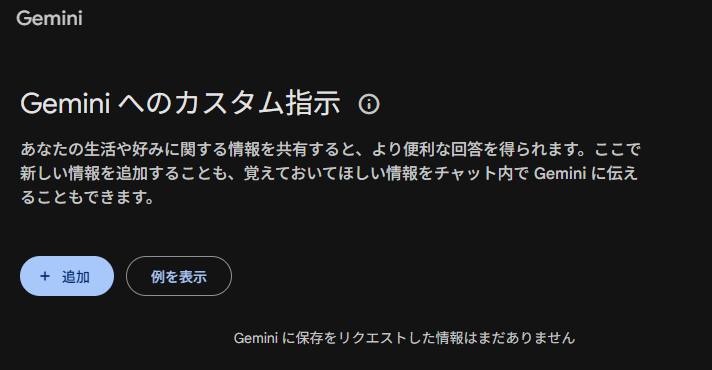 メモリには大きく2種類あります。ひとつはパーソナルコンテキスト(Personal Context)で、過去の会話履歴からユーザーの好みや傾向をGeminiが自動的に推論して蓄積するものです。もうひとつは保存された情報(Saved Info)で、ユーザーが「私はエンジニアです」「回答は箇条書きにして」などと明示的に指示した情報を保存するものです。この2つはそれぞれ独立して管理されています。