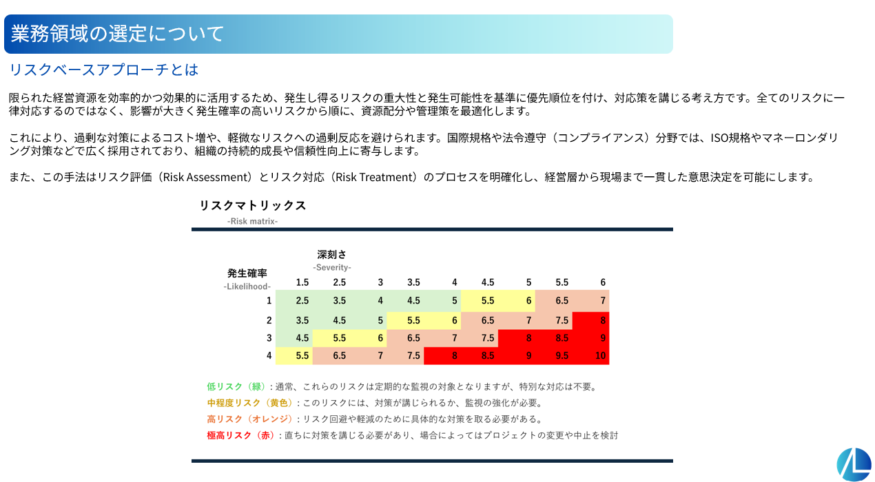 これらを踏まえ、発生可能性 × 影響度の観点でリスクレベルを評価する、いわゆるリスクベースアプローチを取ることが有効です。