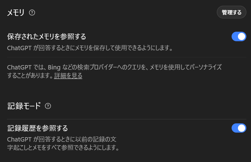メモリには2種類あり、ひとつはユーザーが「覚えておいて」と明示的に指示した情報を保存する保存されたメモリ(Saved Memories)、もうひとつは特に指示しなくてもChatGPTが過去の会話履歴を自動的に参照し、回答に反映する記録履歴(Reference chat history)です。。2025年4月のアップデート以降、後者の機能が大幅に強化され、過去のすべての会話を横断的に参照して回答が生成されるようになっています。なお、保存されたメモリと記録履歴(Reference chat history)からの参照は、それぞれ独立してオン・オフを設定することができます。
